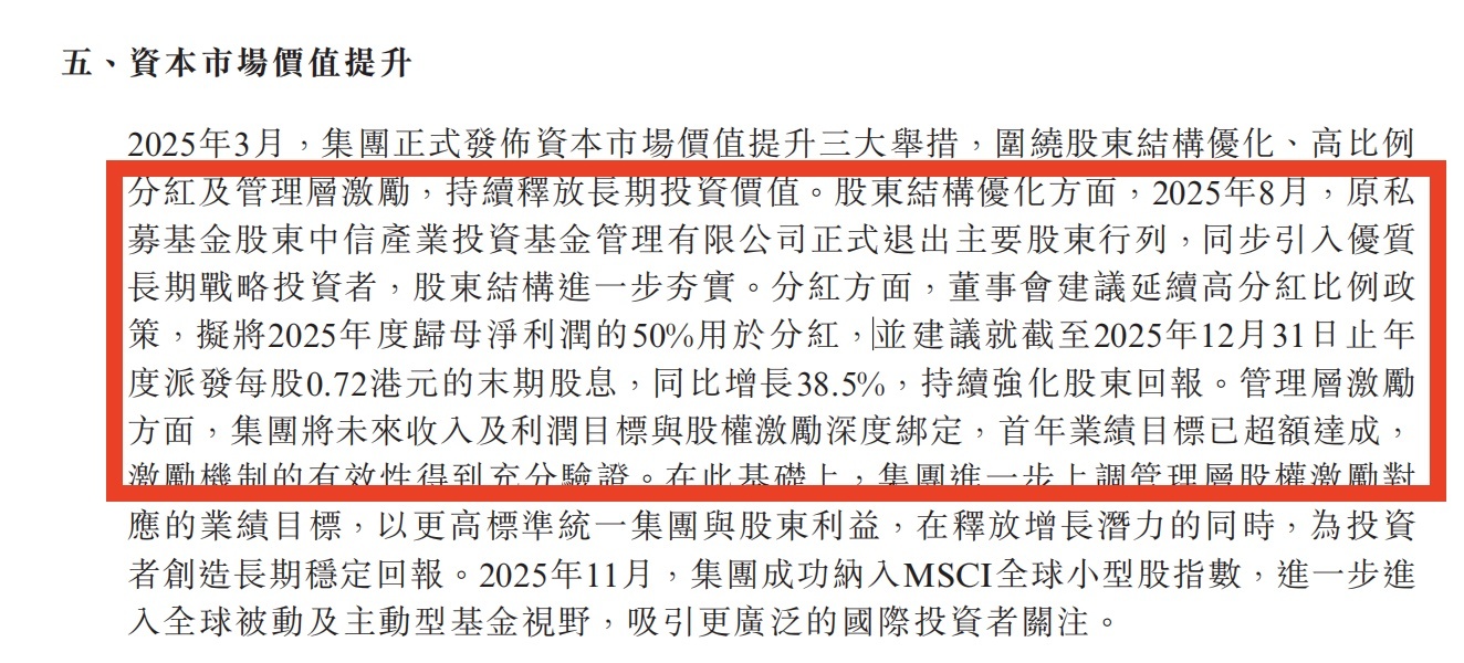 资本市场层面,公司2025年推进股东结构优化、高比例分红与管理层激励,建议末期股息每股0.72港元,同比增长38.5%,计划将归母净利润50%用于分红,同时纳入MSCI全球小型股指数,提升资本市场关注度。但高管也坦言,股东结构优化后,长期投资者培育、市值管理仍需持续发力,管理层股权激励目标上调后,后续业绩达成压力相应增加。